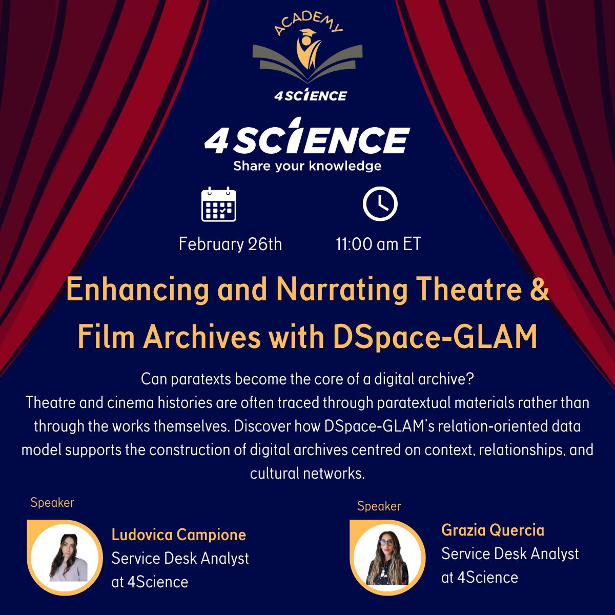 4Science Academy: Enhancing & Narrating Theatre and Film Archives with DSpace‑GLAM 🚨 The 4Science Academy is back ! 🚨 4Science Academy: Enhancing & Narrating Theatre and Film Archives with DSpace‑GLAM: Join us for the first free webinar of the year! 🎭Enhancing...
